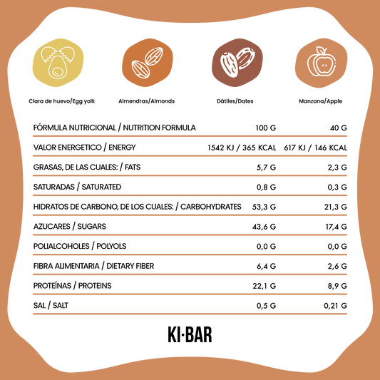 Porque el azúcar refinado no da ningún beneficio a la salud sino todo lo contrario, y aún más con el estilo de vida moderno donde hay un exceso de comida y sedentarismo, nuestras KI-BAR no contienen azúcar agregada. La mezcla de grasa y azúcar genera adicción en las personas y las grandes industrias lo saben, por ello crean productos a los que nos volvemos adictos y consumimos más y más. Nosotros endulzamos las barras con los propios ingredientes de la misma, generando un sabor suave y natural. Los dátiles son nuestro gran aliado aportando sabor, energía y nutrición al organismo.
