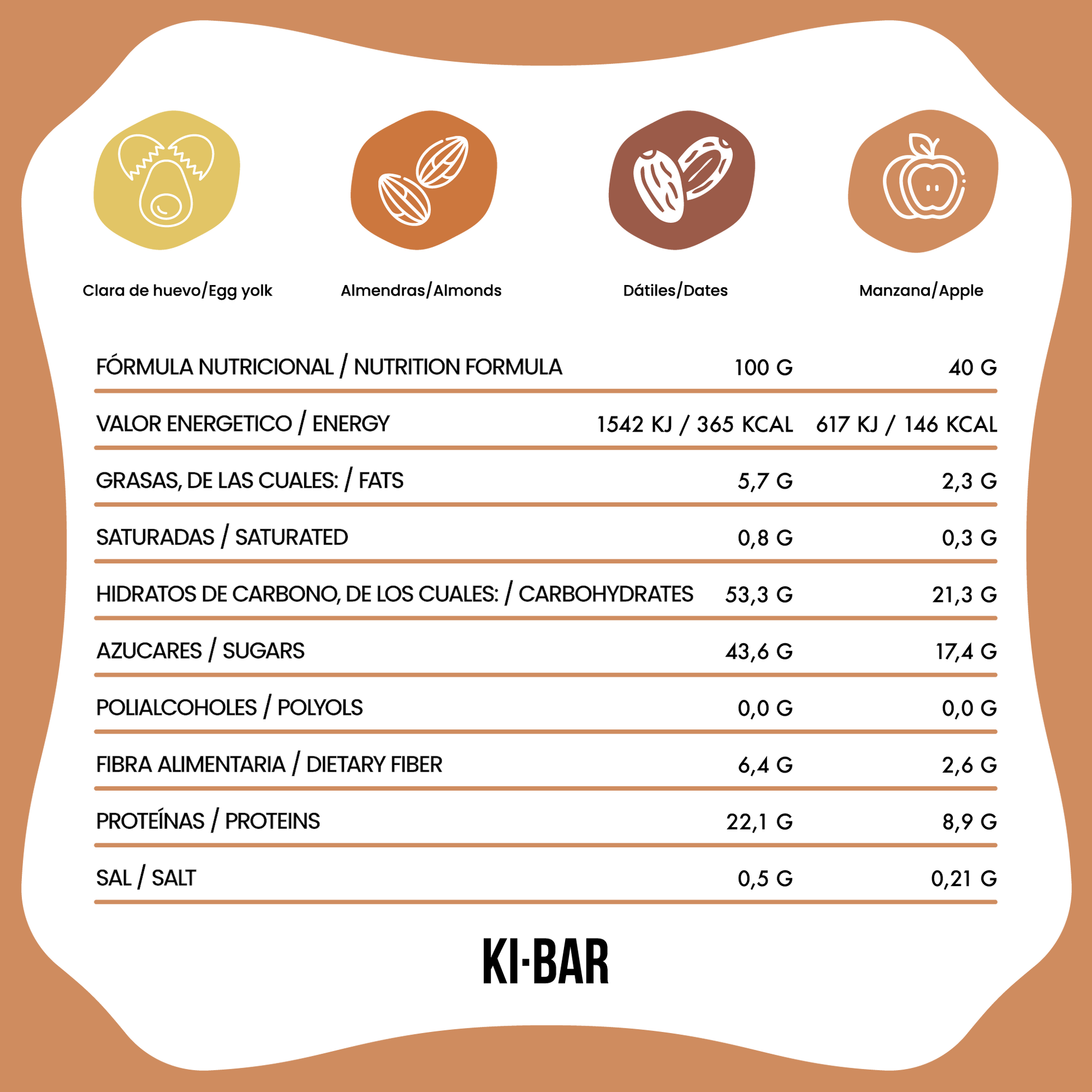 Porque el azúcar refinado no da ningún beneficio a la salud sino todo lo contrario, y aún más con el estilo de vida moderno donde hay un exceso de comida y sedentarismo, nuestras KI-BAR no contienen azúcar agregada. La mezcla de grasa y azúcar genera adicción en las personas y las grandes industrias lo saben, por ello crean productos a los que nos volvemos adictos y consumimos más y más. Nosotros endulzamos las barras con los propios ingredientes de la misma, generando un sabor suave y natural. Los dátiles son nuestro gran aliado aportando sabor, energía y nutrición al organismo.